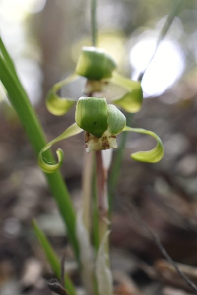 めいとくの森には、キンラン以外にも貴重な植物が自生しています。今年は、落ち着いた緑色が美しいシュンラン(春蘭)も慎ましく咲いていました。